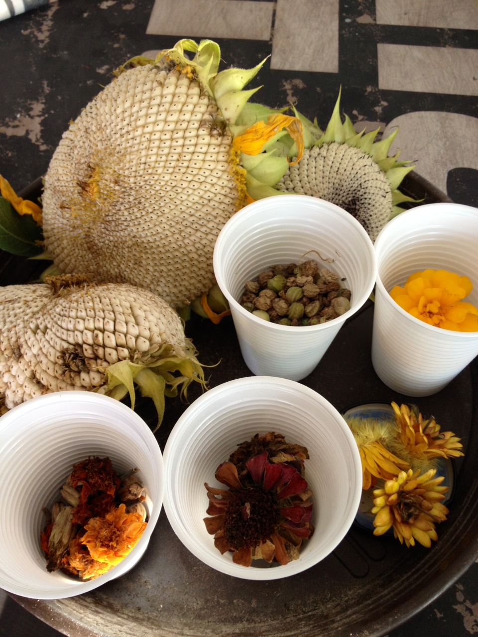 Tässäpä teille pieni palanen luonnon ihmeitä lumen keskelle: ekan kuvan keltainen kukkanen on ylimääräisen kasvuhepulin saanut syyshohdekukka (kai?), joka kukki loppusyksystä ihan yksinään muuten jo lakastuneella pihamaalla. Alemmassa kuvassa taas on vähän niitä talteen otettuja siemeniä, joilla meinaan startata seuraavan kasvatuskauden. Sillä lailla se vaan pyörähtää taas käyntiin, seuraava sesonki!