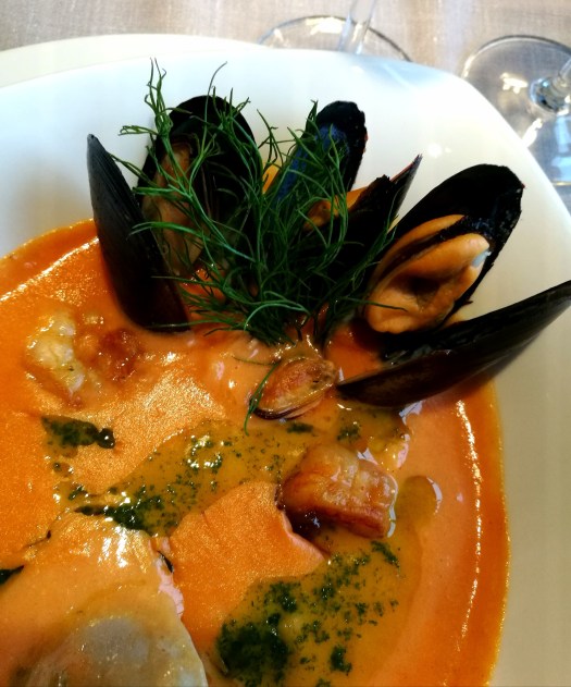 (Ruokakuvissa äyriäischowder Megastarin a la carte -ravintolassa ja panimoravintola Humalakodan alkupalalautanen.)