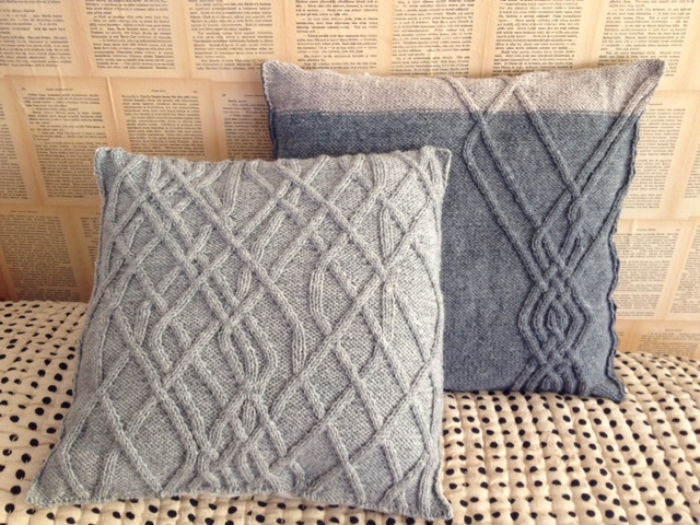 Vähitellen olen päässyt kärryille palmikko-ohjeista, mutta tähän mennessä olen tehnyt vaikeammat kuviot pelkkinä tilkkuina. Keksin kasata ne tyynyiksi, koska ne sattuivat kaikki olemaan aika harmonisen harmaita. Lavensin myös pimahtaneen palmikon käsitettä eli kokeilin, miltä näyttää, jos palmikon eri osat lähtevätkin ihan omille teilleen kireästä kuviosta. Tykkäsin. Lisää koetilkkuja eli tyynyjä, siis.